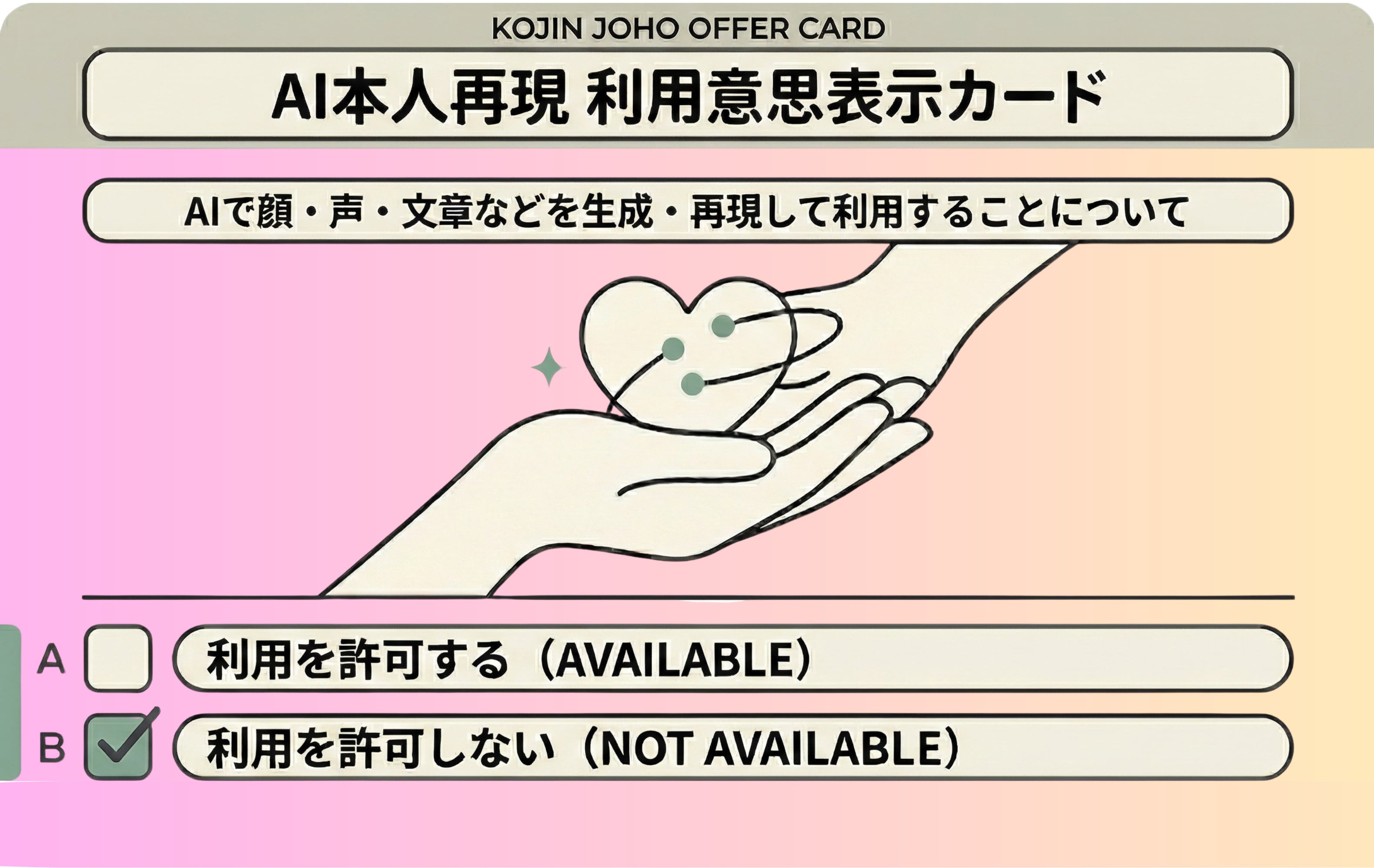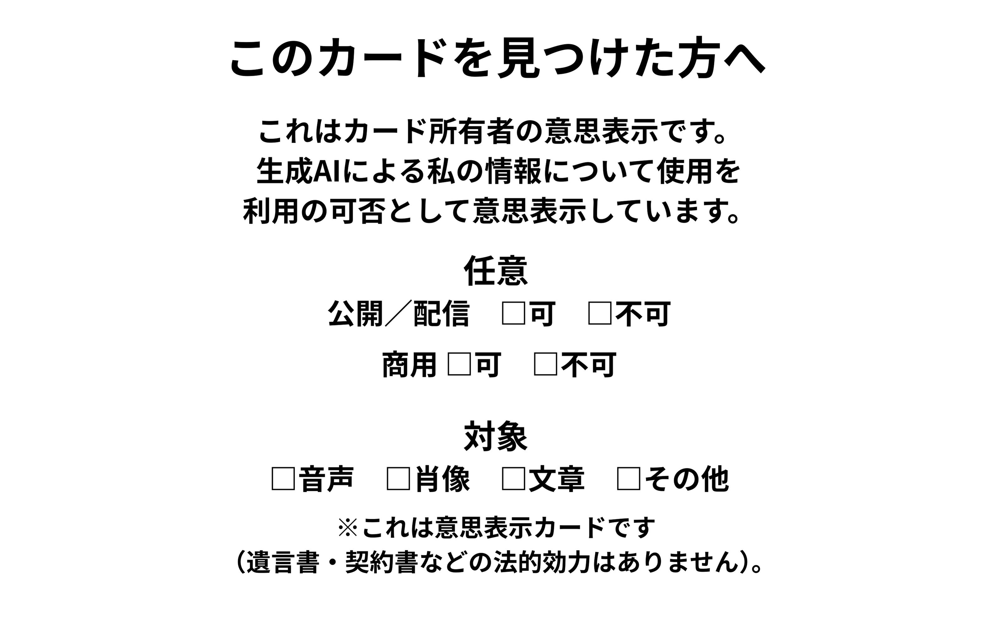 このカードは、AIによる「顔・声・文章」の利用について 『許可しない』という意思を、チェックで残して持ち歩ける 財布サイズの意思表示カード です。